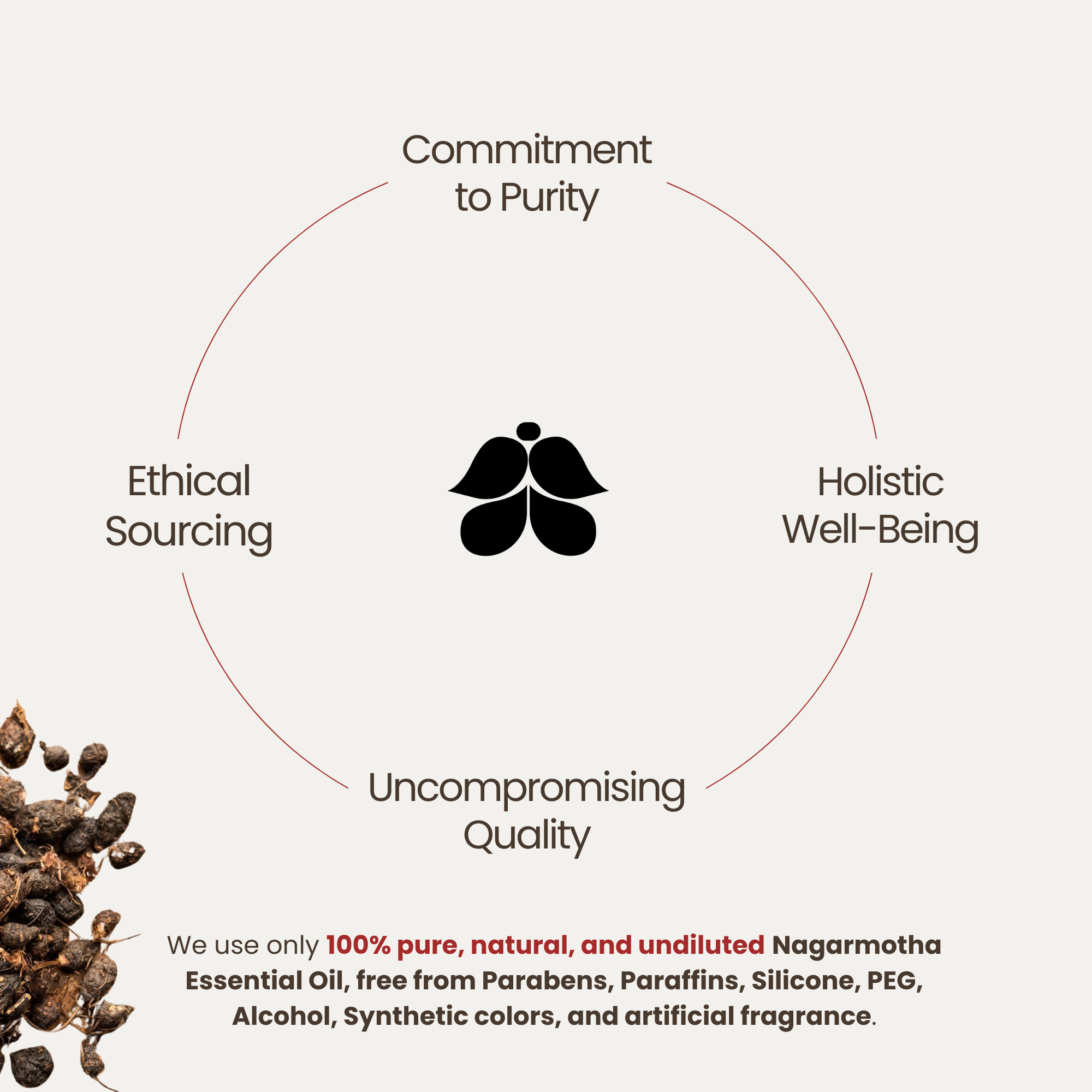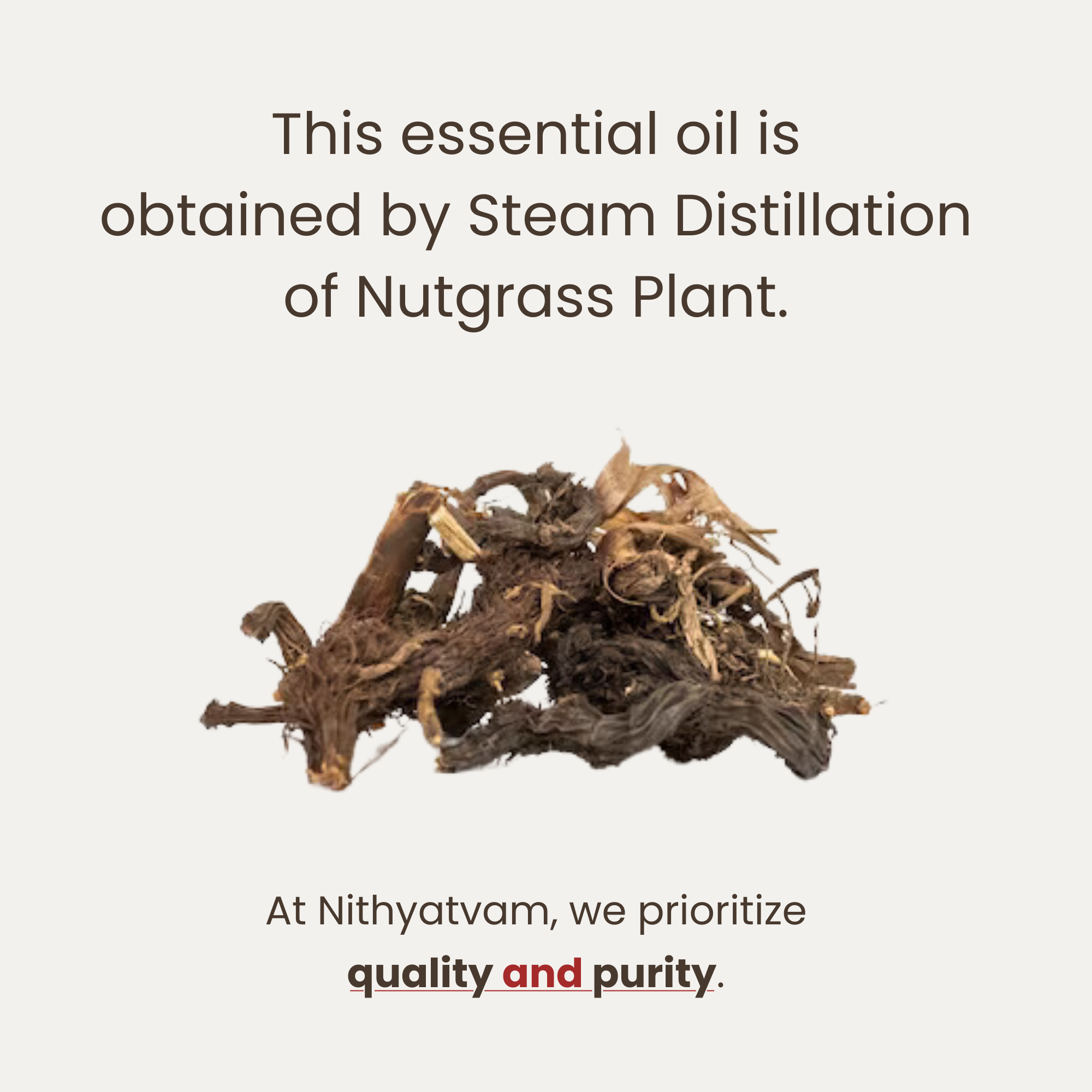At Nithyatvam, we prioritize quality and purity. We use only 100% pure, natural, and undiluted Nagarmotha Essential Oil, free from Parabens, Paraffins, Silicone, PEG, Alcohol, Synthetic colors, and artificial fragrance.