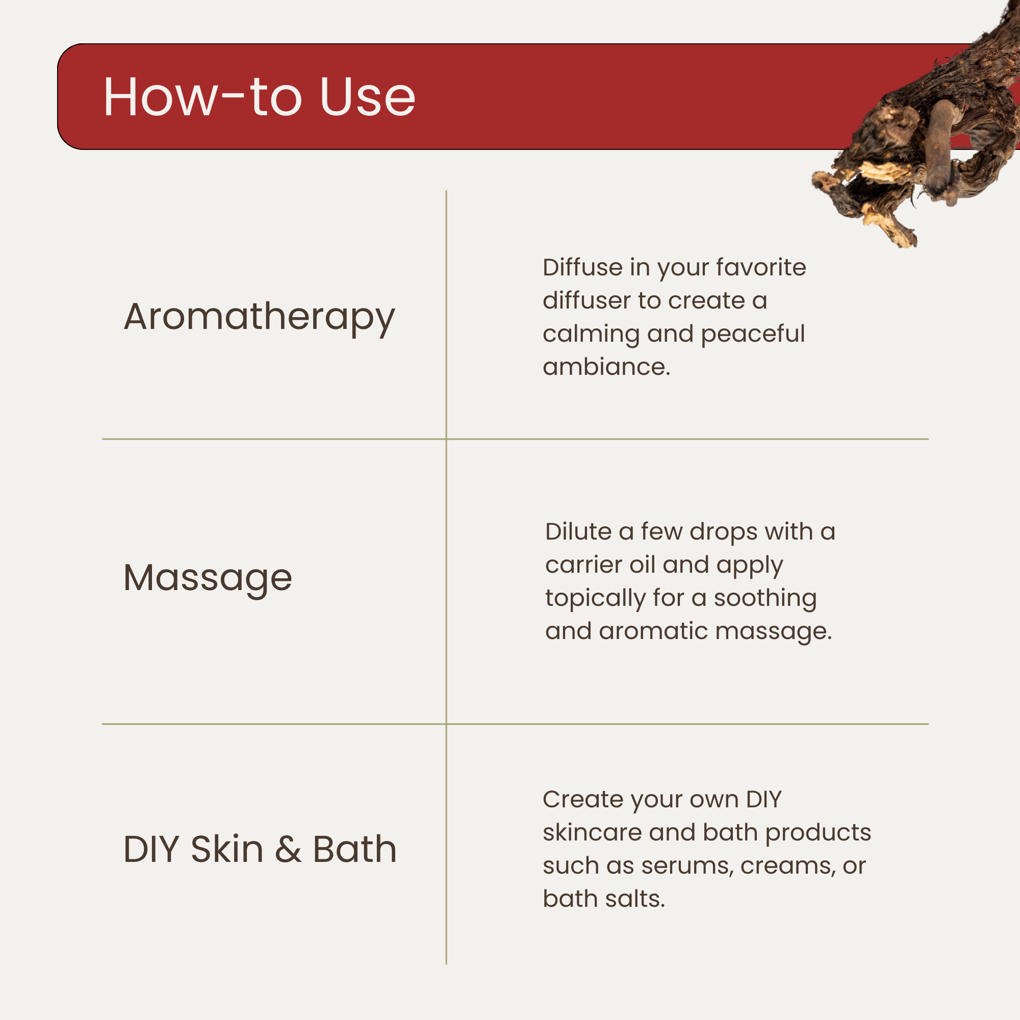 - Bath: Add a few drops to your bathwater for a rejuvenating and meditative soak.